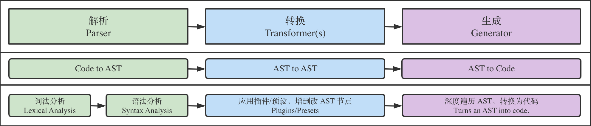 Babel默认使用@babel/parser将代码转换为AST。解析一般分为两个阶段:词法分析和语法分析。